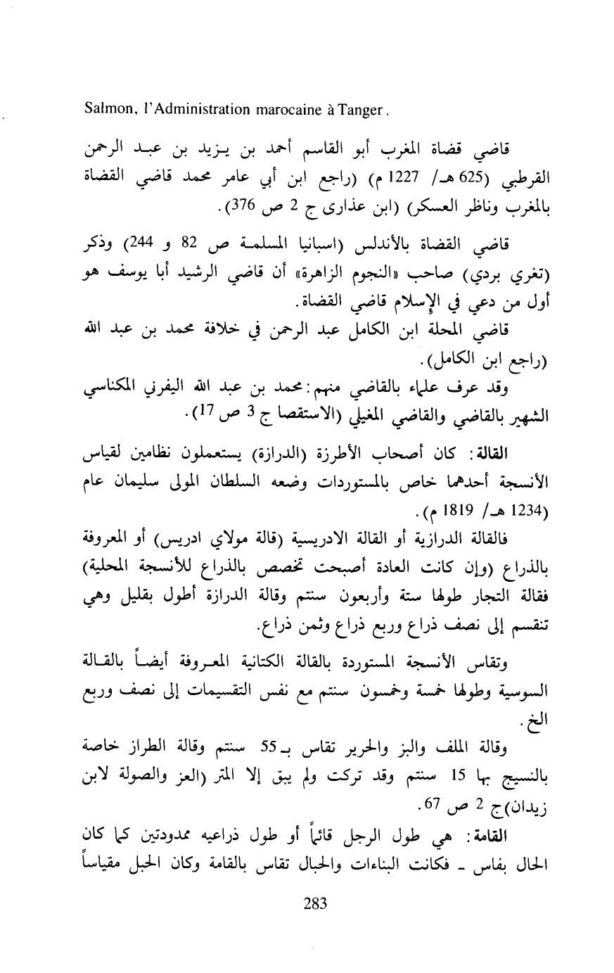 القالة: كان أصحاب الأطرزة (الدرازة) يستعملون نظامين لقياس الأنسجة أحدهما خاص بالمستوردات وضعه السلطان المولى سليمان عام (1234 هـ / 1819 م).
