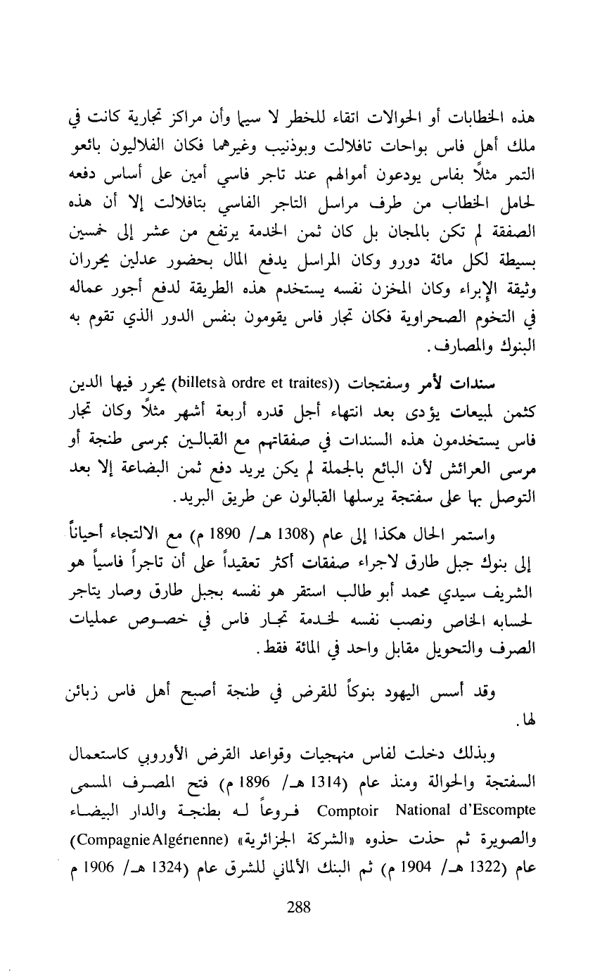 وبذلك دخلت لفاس منهجيات وقواعد القرض الأوروبي كاستعمال السفتجة والحوالة ومنذ عام (1314 هـ/ 1896 م) فتح المصرف المسمى d'Escompte Comptoir National فروعًا له بطنجة والدار البيضاء والصويرة ثم حذت حذوه "الشركة الجزائرية" (CompagnieAlgerienne) عام (1322 هـ 1904 م) ثم البنك الألماني للشرق عام (1324 هـ /1906 م