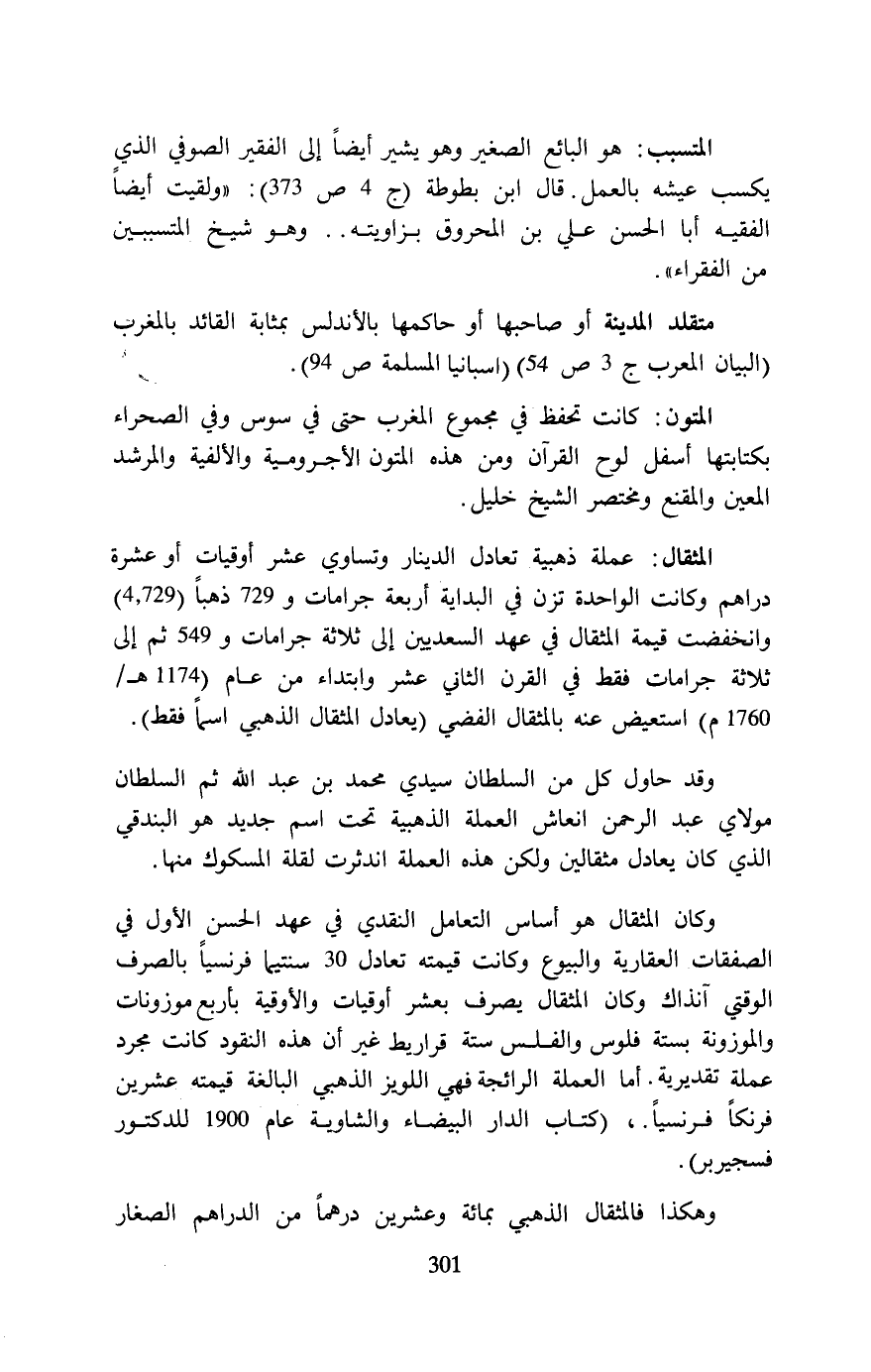 المثقال: عملة ذهبية تعادل الدينار وتساوي عشر أوقيات أو عشرة دراهم وكانت الواحدة تزن في البداية أربعة جرامات و 729 ذهبًا (4,729) وانخفضت قيمة المثقال في عهد السعديين إلى ثلاثة جرامات و 549 ثم إلى ثلاثة جرامات فقط في القرن الثاني عشر وابتداء من عام (1174 هـ/ 1760 م) استعيض عنه بالمثقال الفضي (يعادل المثقال الذهبي اسمًا فقط).
