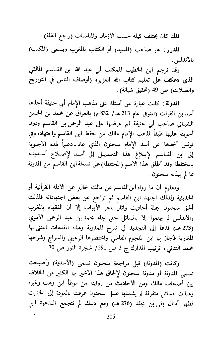 المدونة: كانت عبارة عن أسئلة على مذهب الإمام أبي حنيفة أخذها أسد بن الفرات (المتوفى عام 213 هـ/ 832 م) بالعراق عن محمد بن الحسن الشيباني صاحب أبي حنيفة ثم عرضها على عبد الرحمن بن القاسم ودون أجوبته عليها طبقًا لمذهب الإمام مالك من حفظ ابن القاسم واجتهاده وفي تونس أخذها عن أسد الإمام سحنون الذي عاد- دعمًا لهذه الأجوبة إلى ابن القاسم لإبلاغ هذا التعديل إلى أسد لإصلاح أسديته بالمختلطة وقد أطلق هذا الاسم (المختلطة) على نسخة ابن القاسم من المدونة مما لم يهذبه سحنون.