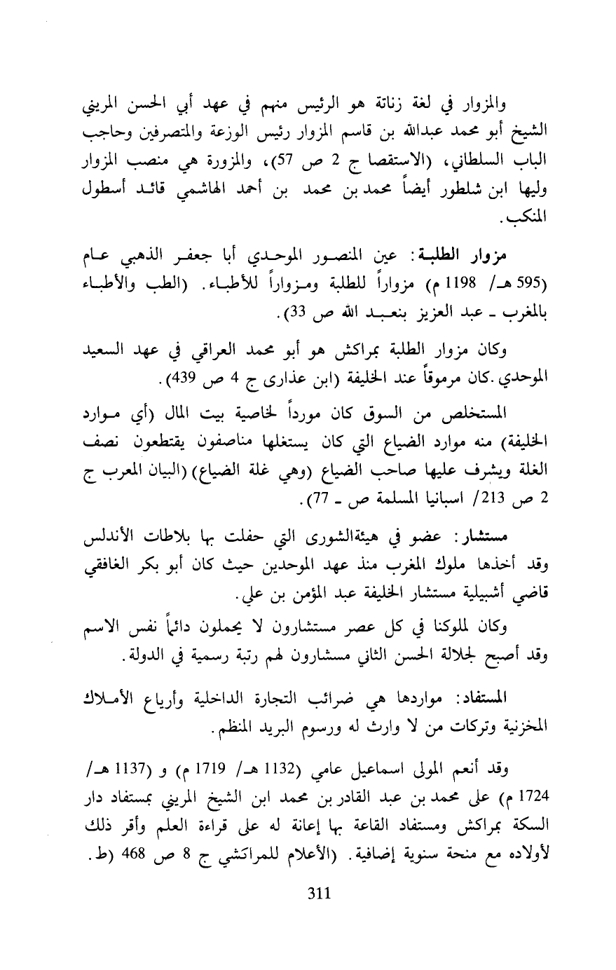 مستشار: عضو في هيئة الشورى التي حفلت بها بلاطات الأندلس وقد أخذها ملوك المغرب منذ عهد الموحدين حيث كان أبو بكر الغافقي قاضي أشبيلية مستشار الخليفة عبد المؤمن بن علي.