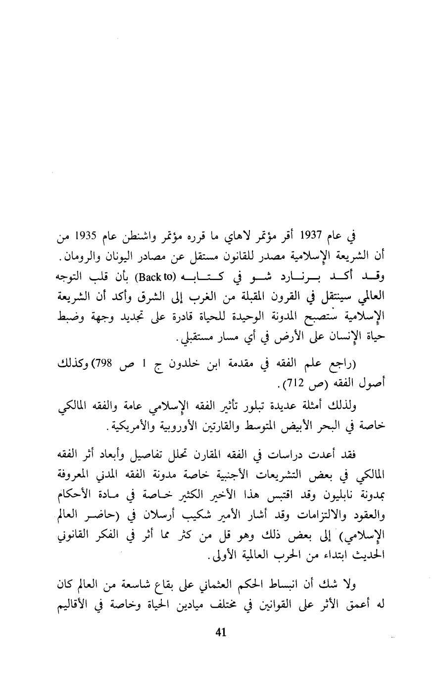 في عام 1937 أقر مؤتمر لاهاي ما قرره مؤتمر واشنطن عام 1935 من أن الشريعة الِإسلامية مصدر للقانون مستقل عن مصادر اليونان والرومان.