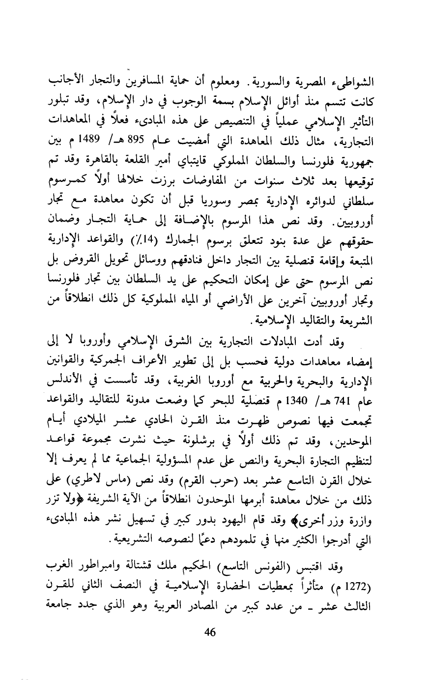 الشواطئ المصرية والسورية. ومعلوم أن حماية المسافرينّ والتجار الأجانب كانت تتسم منذ أوائل الِإسلام بسمة الوجوب في دار الِإسلام، وقد تبلور التأثير الِإسلامي عملياً في التنصيص على هذه المبادئ فعلاً في المعاهدات التجارية، مثال ذلك المعاهدة التي أمضيت عام 895 هـ/ 1489 م بين جمهورية فلورنسا والسلطان المملوكي قايتباي أمير القلعة بالقاهرة وقد تم
