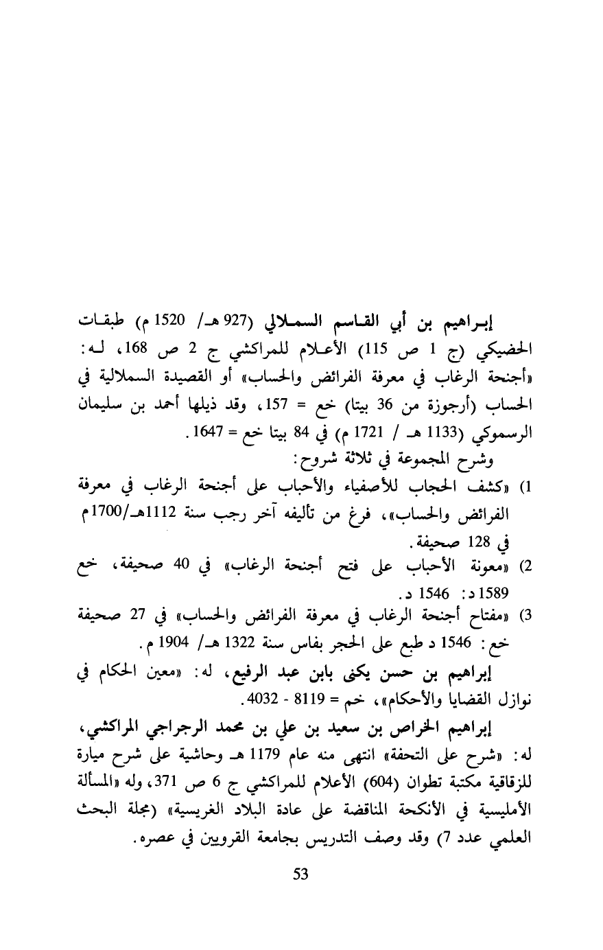 إبراهيم بن أبي القاسم السملالي (927 هـ / 1520 م) طبقات الحضيكي (ج 1 ص 115) الأعلام للمراكشي ج 2 ص 168، له: "أجنحة الرغاب في معرفة الفرائض والحساب" أو القصيدة السملالية في الحساب (أرجوزة من 36 بيتا) خع = 157، وقد ذيلها أحمد بن سليمان الرسموكي) (1133 هـ/ 1721 م) في 84 بيتا خع = 1647.