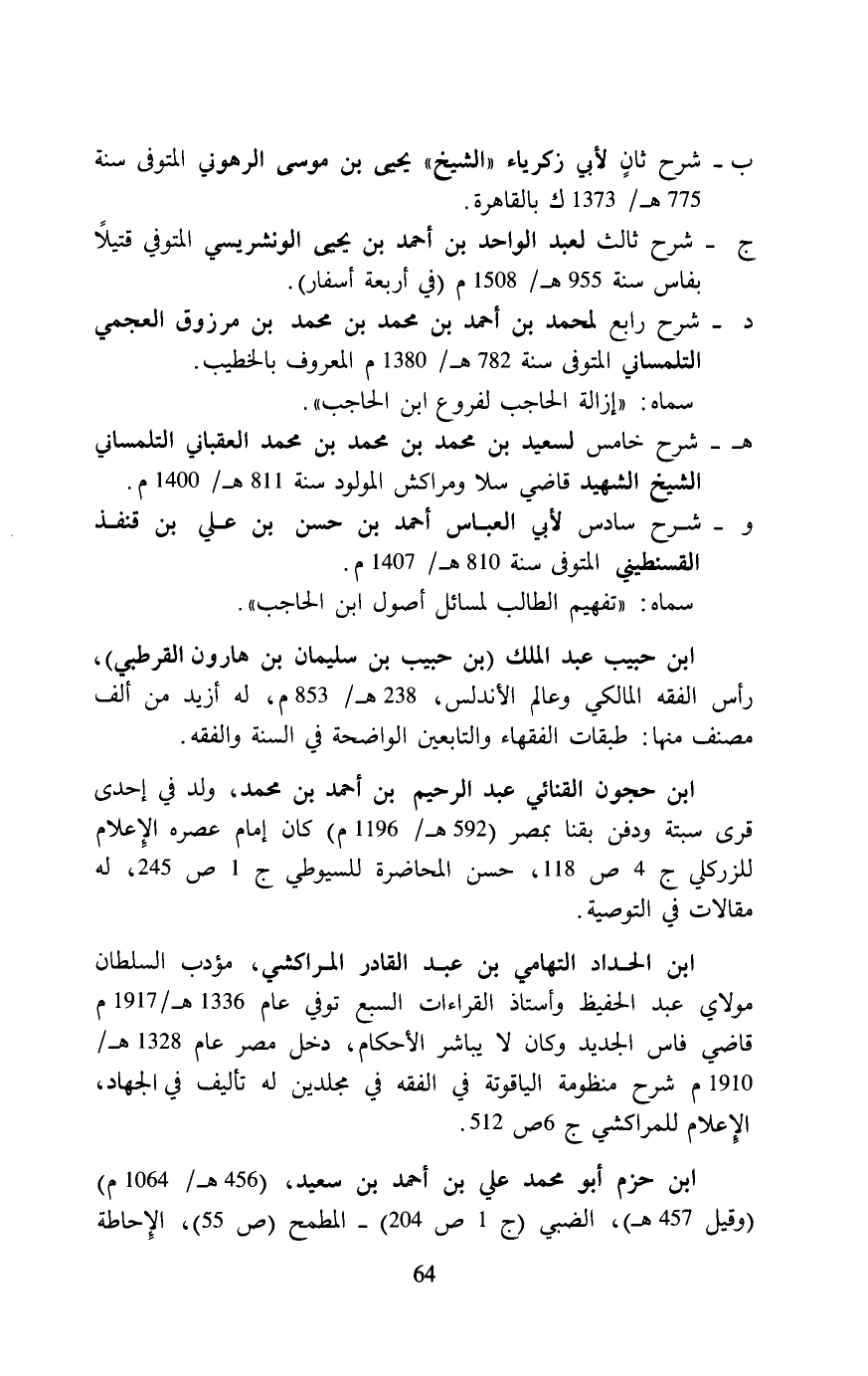 ب- شرح ثانٍ لأبي زكرياء "الشيخ" يحيى بن موسى الرهوني المتوفى سنة 775 هـ / 1373 ك بالقاهرة.