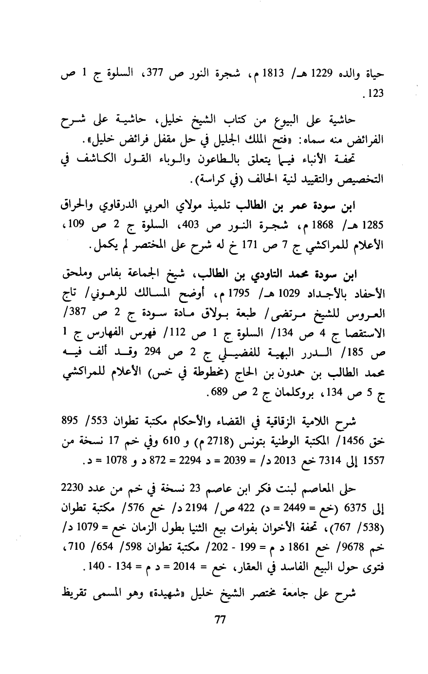 ابن سودة عمر بن الطالب تلميذ مولاي العربي الدرقاوي والحراق 1285 هـ/ 1868 م، شجرة النور ص 403، السلوة ج 2 ص 109، الأعلام للمراكشي ج 7 ص 171 شرح على المختصر لم يكمل.