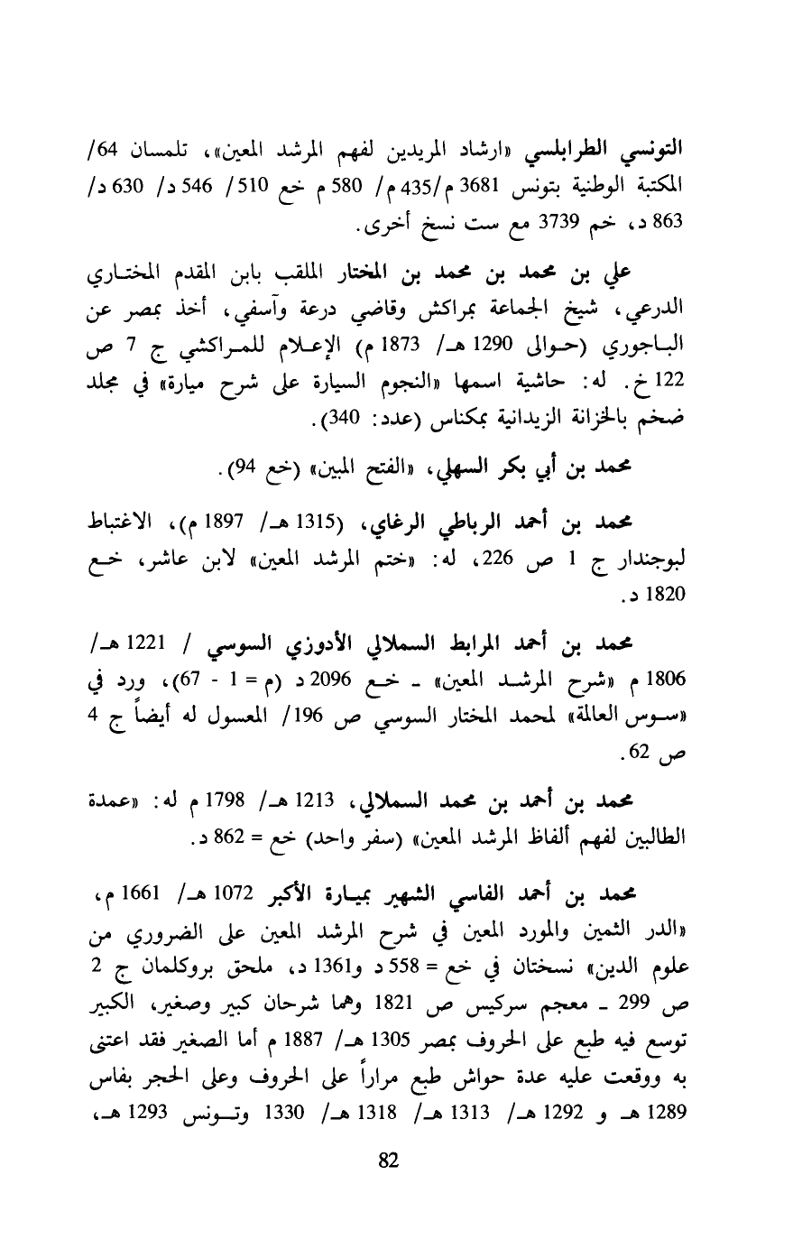 التونسي الطرابلسي "إرشاد المريدين لفهم المرشد المعين"، تلمسان 64 / المكتبة الوطنية بتونس 3681 م/ 453 م /580 م خع 510/ 546 د/ 630 د/ 863 د، خم 3739 مع ست نسخ أخرى.