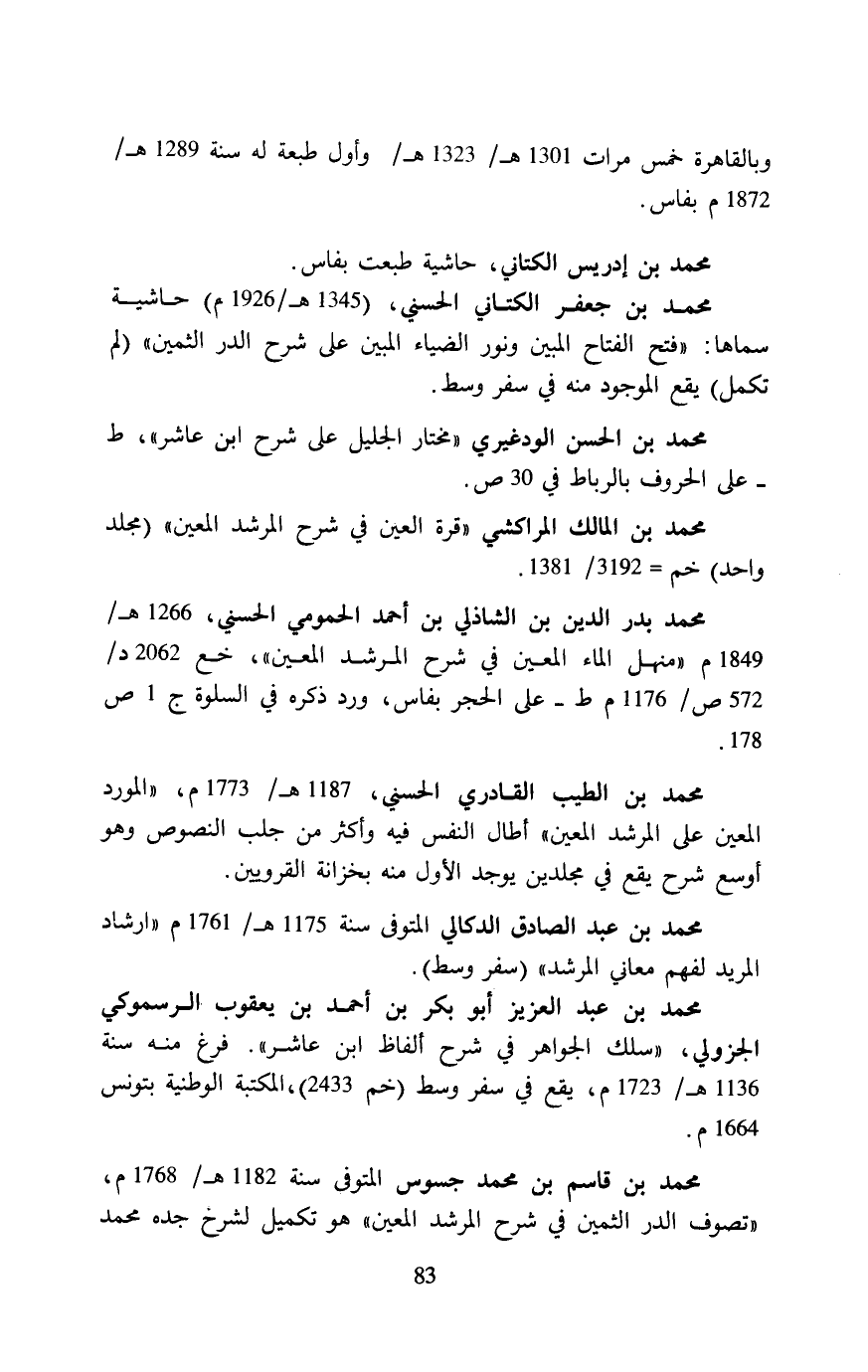 محمد بن الطيب القادري الحسني، 1187 هـ/ 1773 م، "المورد المعين على المرشد المعين" أطال النفس فيه وأكثر من جلب النصوص وهو أوسع شرح يقع في مجلدين يوجد الأول منه بخزانة القرويين.