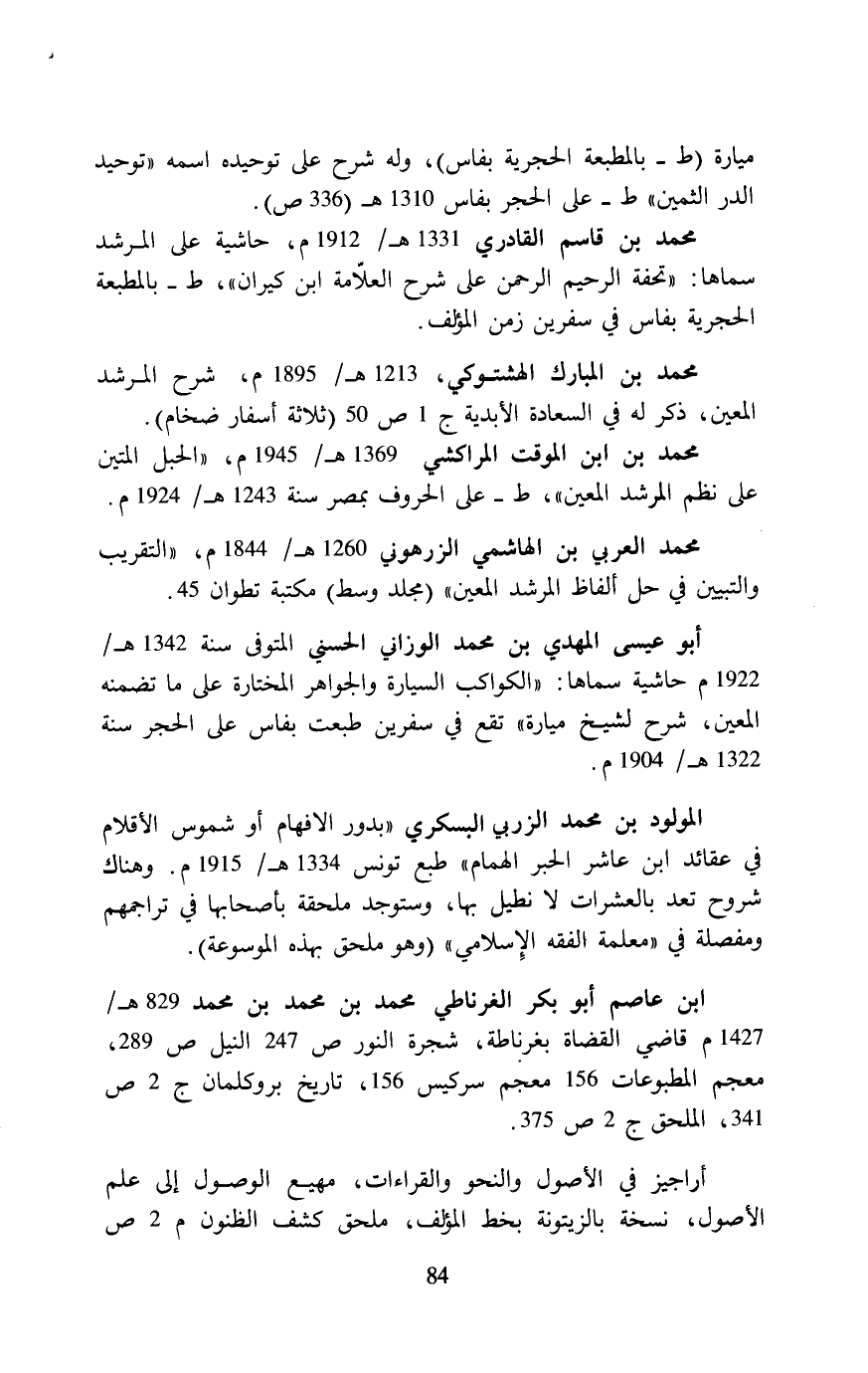 محمَّد بن المبارك الهشتوكي، 1213 هـ-/ 1895 م، شرح المرشد المعين، ذكر له في السعادة الأبدية ج 1 ص 50 (ثلاثة أسفار ضخام).