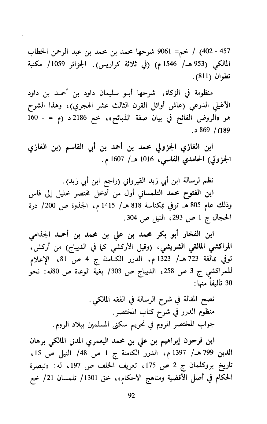 457 - 402) / = خم = 9061 شرحها محمَّد بن محمَّد بن عبد الرحمن الخطاب المالكي (953 هـ/ 1546 م) (في ثلاثة كراريس). الجزائر 1059 / مكتبة تطوان (811).