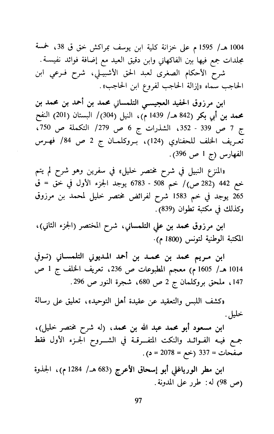 ابن مسعود أبو محمَّد عبد الله بن محمَّد، (له شرح مختصر خليل)، جمع فيه الفوائد والنكت المتفرقة في الشروح الجزء الأوّل فقط صفحات = 337 (خع = 2078 = د).