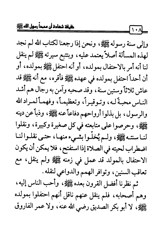 وإلى سنة رسوله - صلى الله عليه وسلم -، ونحن إذا رجعنا لكتاب الله لم نجد لهذه المسألة أصلا يعتمد عليه، وبتتبع سيرته وسنته - صلى الله عليه وسلم - لم ينقل لنا أنه أمر بالاحتفال بمولده، أو أنه احتفل - صلى الله عليه وسلم - بمولده، أو أن أحدا احتفل بمولده في عهده - صلى الله عليه وسلم - فأقره، مع أنه - صلى الله عليه وسلم - قد عاش ثلاثا وستين سنة، وقد صحبه وآمن به رجال هم أشد الناس محبة له وتوقيرا وتعظيما وفهما لمراد الله والرسول، بل بذلوا أرواحهم دفاعا عنه - صلى الله عليه وسلم - وذبا عن دينه - صلى الله عليه وسلم -، وحرصوا على متابعته في كل صغيرة وكبيرة، ونقلوا لنا سنته - صلى الله عليه وسلم - ولم يخلوا بشيء منها، حتى نقلوا لنا اضطراب لحيته في الصلاة إذا استفتح، فلا يمكن أن يكون الاحتفال بالمولد قد عمل في زمنه - صلى الله عليه وسلم -، ولم ينقل مع تعاقب السنين وتوافر الهمم والدواعي لنقله.