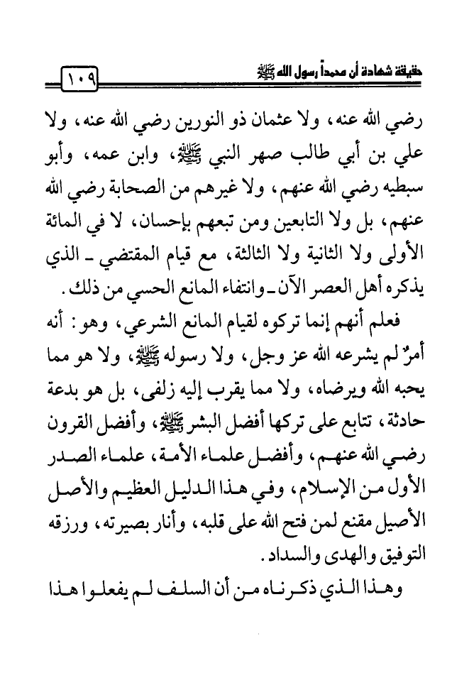 - رضي الله عنه -، ولا عثمان ذو النورين - رضي الله عنه -، ولا على بن أبي طالب صهر النبي - صلى الله عليه وسلم - وابن عمه وأبو سبطيه - رضي الله عنهم -، ولا غيرهم من الصحابة - رضي الله عنهم -، بل ولا التابعين ومن تبعهم بإحسان لا في المائة الأولى ولا الثانية ولا الثالثة، مع قيام المقتضي - الذي يذكره أهل العصر الآن - وانتفاء المانع الحسي من ذلك.