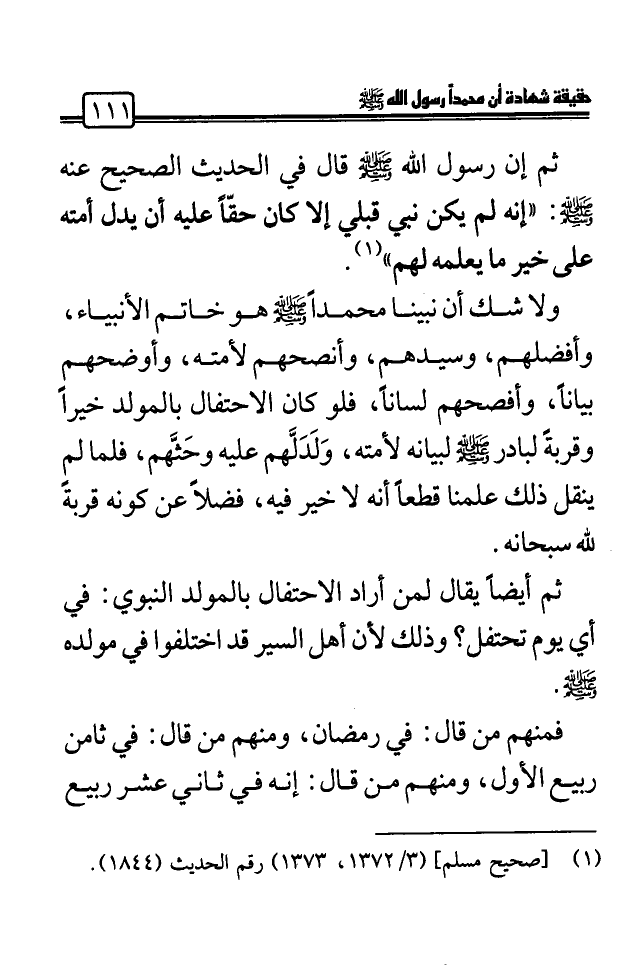 ولا شك أن نبينا محمدا - صلى الله عليه وسلم - هو خاتم الأنبياء، وأفضلهم وسيدهم وأنصحهم لأمته وأوضحهم بيانا وأفصحهم لسانا، فلو كان الاحتفال بالمولد خيرا وقربة لبادر - صلى الله عليه وسلم - لبيانه لأمته ولدلهم عليه وحثهم، فلما لم ينقل ذلك علمنا قطعا أنه لا خير فيه، فضلا عن كونه قربة لله سبحانه.