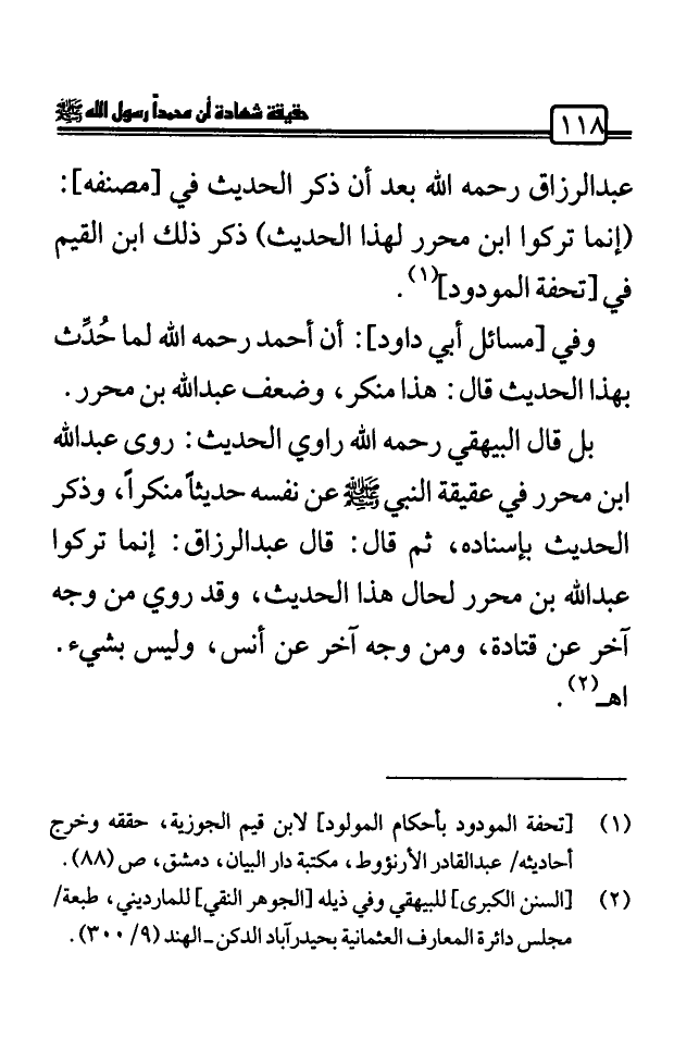 بل قال البيهقي - رحمه الله - راوي الحديث: روى عبد الله بن محرر في عقيقة النبي - صلى الله عليه وسلم - عن نفسه حديثا منكرا، ذكر الحديث بإسناده ثم قال: قال عبد الرزاق: إنما تركوا عبد الله بن محرر لحال هذا الحديث. وقد روي من وجه آخر عن قتادة، ومن وجه آخر عن أنس، وليس بشيء. ا. هـ