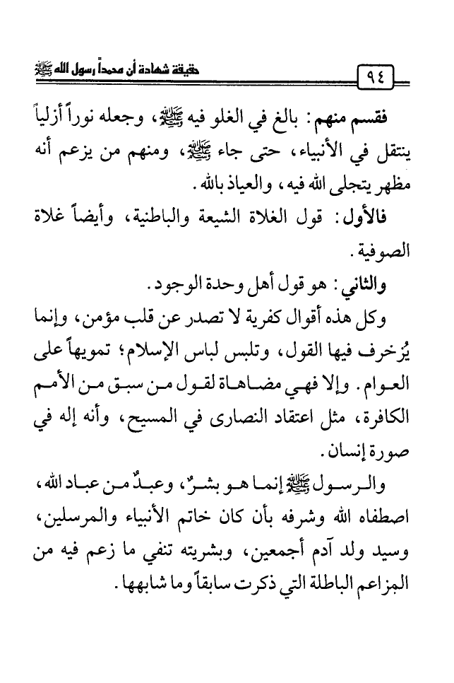 فقسم منهم: بالغ في الغلو فيه - صلى الله عليه وسلم -، وجعله نورا أزليا ينتقل في الأنبياء، حتى جاء - صلى الله عليه وسلم -، ومنهم من يزعم أنه مظهر يتجلى الله فيهن والعياذ بالله.