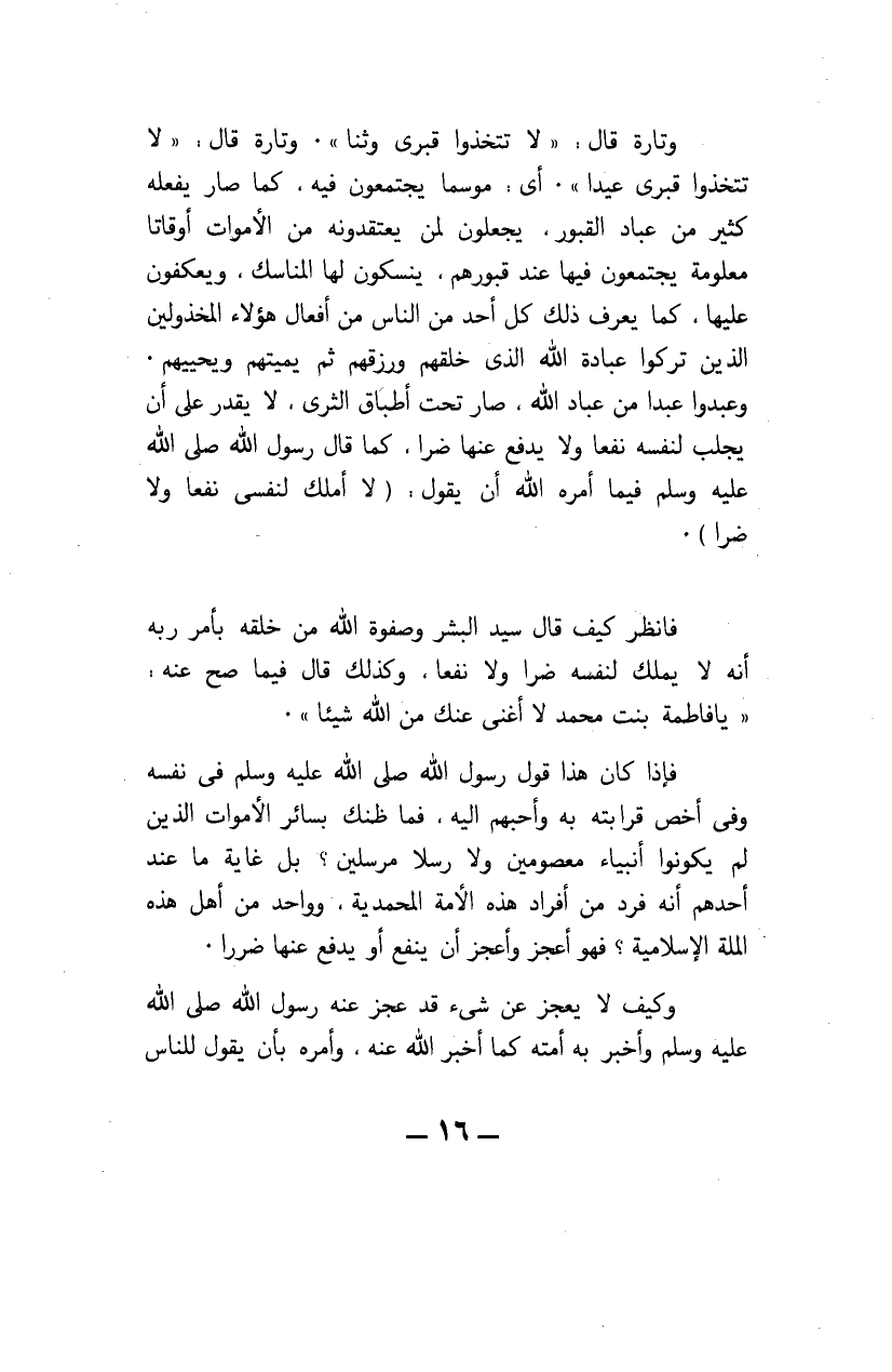 وتارة قال: "لا تتخذوا قبري وثنا". وتارة قال: "لا تتخذوا قبري عيدا" أي: موسما يجتمعون فيه كما صار يفعله كثير من عباد القبور يجعلون لمن يعتقدون من الأموات أوقاتا معلومة يجتمعون فيها عند قبورهم، ينسكون لها المناسك، ويعكفون عليها، كما يعرف ذلك كل أحد من الناس من أفعال هؤلاء المخذولين، الذين تركوا عبادة الله الذي خلقهم ورزقهم ثم يميتهم ويحييهم وعبدوا عبدا من عباد الله، صار تحت أطباق الثرى، لا يقدر على أن يجلب لنفسه نفعا ولا يدفع عنها ضرا، كم قال رسول الله صلى الله عليه وسلم فيما أمره الله أن يقول: {لاَ أَمْلِكُ لِنَفْسِي نَفْعاً وَلا ضَرّاً} فانظر كيف قال سيد البشر وصفوة الله من خلقه بأمر ربه أنه لا يملك لنفسه ضرا ولا نفعا وكذلك قال فيما صح عنه: "يا فاطمة بنت محمد لا أغني عنك من الله شيئا"