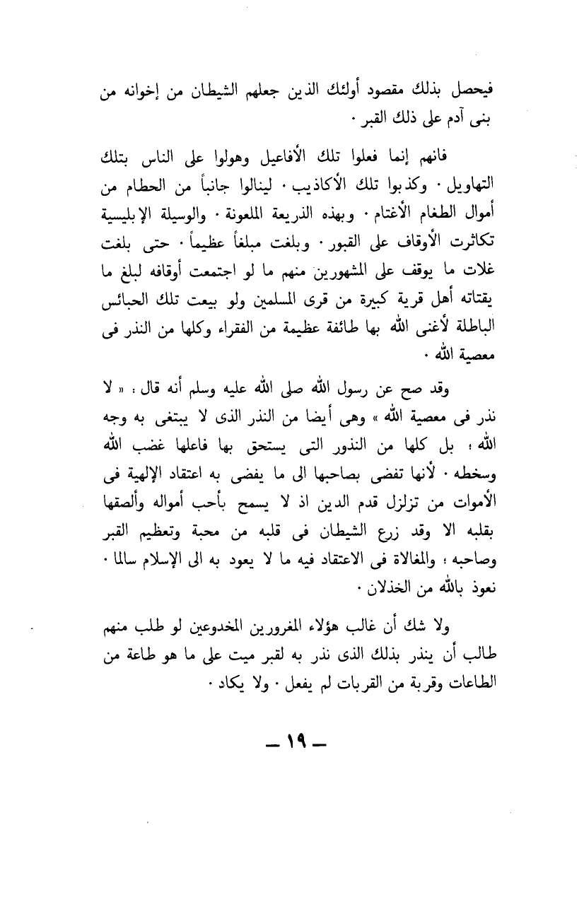 فيحصل بذلك مقصود أولئك الذين جعلهم الشيطان من إخوانه من بني آدم على ذلك القبر. فإنهم إنما فعلوا تلك الأفاعيل وهولوا على الناس بتلك التهاويل، وكذبوا تلك الأكاذيب، لينالوا جانبا من الحطام من أموال الطغام الأغتام وبهذه الذريعة الملعونة، والوسيلة الإبليسية تكاثرت الأوقاف على القبور، وبلغت مبلغا عظيما، حتى بلغت غلات ما يوقف على المشهورين منهم ما لو اجتمعت أوقافه لبلغ ما يقتاته أهل قرية كبيرة من قرى المسلمين. ولو بيعت تلك الحبائس الباطلة لأغنى الله بها طائفة عظيمة من الفقراء، وكلها من النذر في معصية الله.