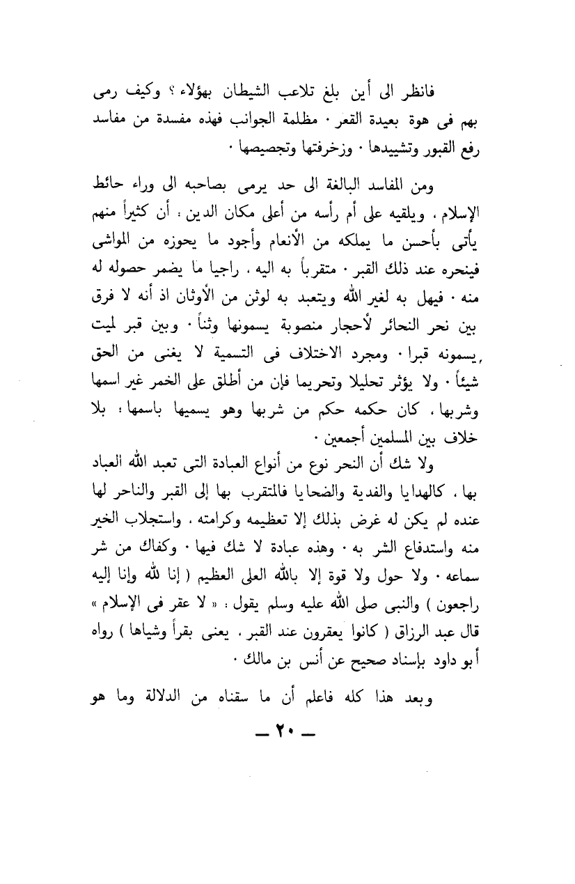 ولاشك أن النحر نوع من أنواع العبادة التي تعبد الله العباد بها، كالهدايا والفدية والضحايا، فالمتقرب بها إلى القبر والناحر لها عنده لم يكن له غرض بذلك إلا تعظيمه وكرامته، واستجلاب الخير منه واستدفاع الشر به. وهذه عبادة لاشك فيها. وكفاك من شر سماعه. ولا حول ولا قوة إلا بالله العلي العظيم {إِنَّا لِلَّهِ وَإِنَّا إِلَيْهِ رَاجِعُونَ} . والنبي صلى الله عليه وسلم يقول: "لا عقر في الإسلام" قال عبد الرزاق: "كانوا يعقرون عند القبر، يعني بقرا وشياها "