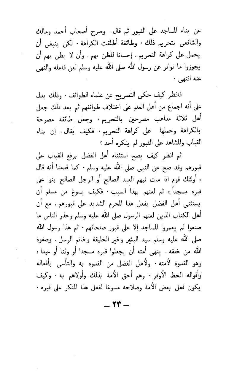 فانظر كيف حكى التصريح عن عامة الطوائف؟ وذلك يدل على أنه إجماع من أهل العلم على اختلاف طوائفهم ثم بعد ذلك جعل أهل ثلاثة مذاهب مصرحين بالتحريم، وجعل طائفة مصرحة بالكراهة وحملها على كراهة التحريم. فكيف يقال: إن بناء القباب والمشاهد على القبور لم ينكره أحد؟.