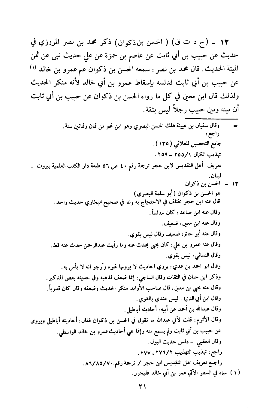13 - خ د ت ق الحسن بن ذكوان ذكر محمد بن نصر المروزي في حديث عن حبيب بن أبي ثابت عن عاصم بن ضمرة عن علي حديث نهى عن ثمن الميتة الحدديث قال محمد بن نصر سمعه الحسن بن ذكواعن عمرو بن خالد (1) عن حبيب بن أبي ثابت فدلسه بإسقاط عمرو بن خالد لانه منكر الحديث وكذلك قال بن معين في كل ما رواه الحسن بن ذكوان عن حبيب بن أبي ثابت ان بينه وبين حبيب رجلا ليس بثقة.