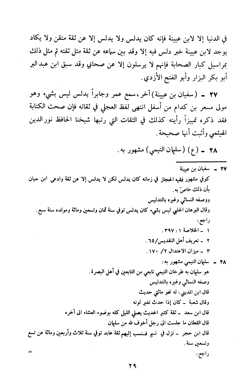 27 - سفيان بن عيينة آخر سمع عمر وجابر يدلس ليس بشئ وهو مولى مسعر بن كدام من أسفل انتهى لفظ العجلي في ثقاته فان صحت الكتابة فقد ذكره تميزا رأيته كذلك في الثقات التي رتبها شيخنا الحافظ نور الدين الهيثمي وأبت انها صحيحة.