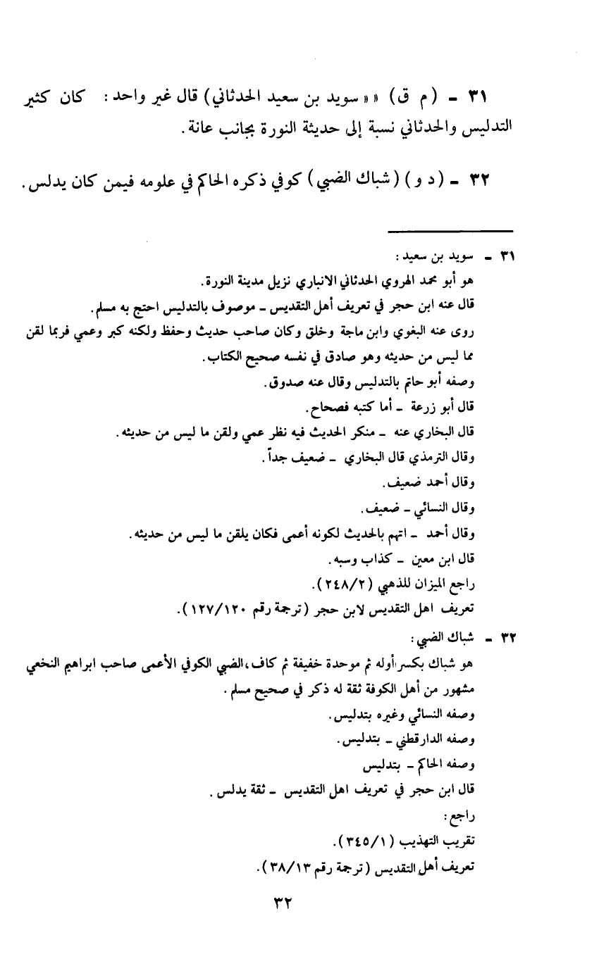 31 - م ق سويد بن سعيد الحدثاني قال غير واحد كان كثير التدليس والحدثاني نسبة إلى حديثة النورة بجانب عانة.