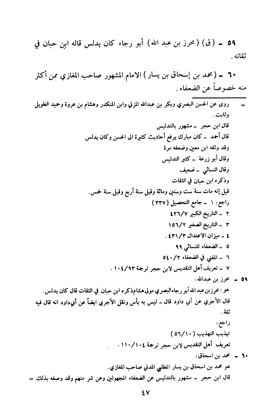 60 - محمد بن إسحاق بن يسار الامام المشهور صاحب المغازي ممن أكثر منه خصوصا عن الضعفاء.