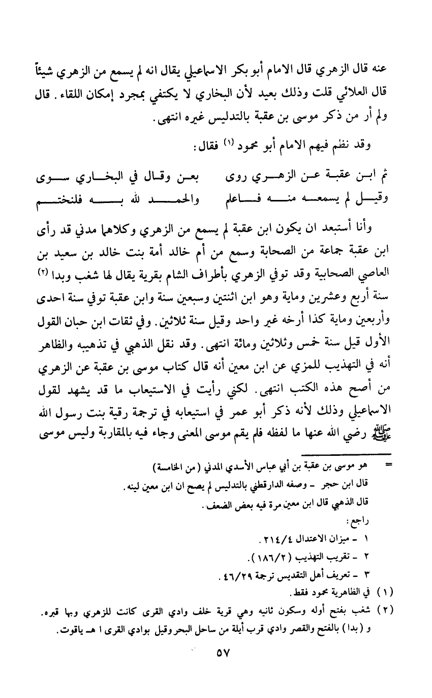 عنه قال الزهري قال الامام أبو بكر الاسماعيلي يقال انه لم يسمع من الزهري شيئا قال العلائي قلت وذلك بعيد لان البخاري لا يكتفي بمجرد إمكان اللقاء قال ولم ار من ذكر موسى بن عقبة بالتدليس غيره انتهى.