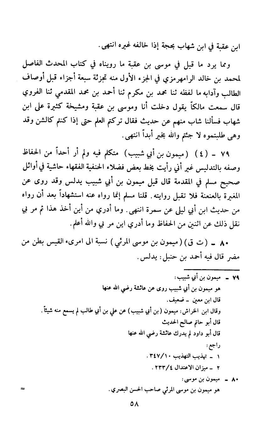 79 - عو ميمون بن أبي شبيب متكلم فيه ولم ار أحدا من الحفاظ وصفه بالتدليس غير اني رأيت بخط بعض فضلاء الحنفية الفقهاء حاشية في أوائل صحيح مسلم في المقدمة فان قيل ميمون بن أبي شبيب مدلس وقد روى عن المغيرة بالعنعنة فلا تقبل ورايته قلنا مسلم إنما رواه عنه استشهادا بعد ان رواه من حديث بن أبي ليلى عن سمره انتهى. وما أدري من أين أخذها ثم مر بي نقل ذلك عن اثنين من الحفاظ وما أدري أين مر بي والله اعلم.