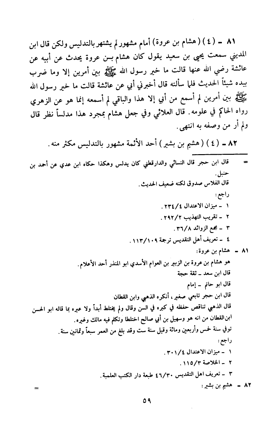 81 - ع هشام بن عروة امام مشهور لم يشتهر بالتدليس ولكن قال بن المديني سمعت يحيى بن سعيد يقول كان هشام بن عروة يحدث عن أبيه عن عائشة رضى الل عنها قالت ما خير رسول الله صلى الله عليه وسلم بين أمرين الا الحديث وما ضرب بيده شيئا الحديث فلما سألته قال أخبرني أبي عن عائشة قالت ما خير رسول الله صلى الله عليه وسلم بين أمرين لم اسمع من أبي الا هذا والباقي لم اسمعه إنما هو عن الزهري رواه الحاكم في علومه قال العلائي وفي جعل هشام بمجرد هذا مدلسا نظر قال ولم ار من وصفه به انتهى.