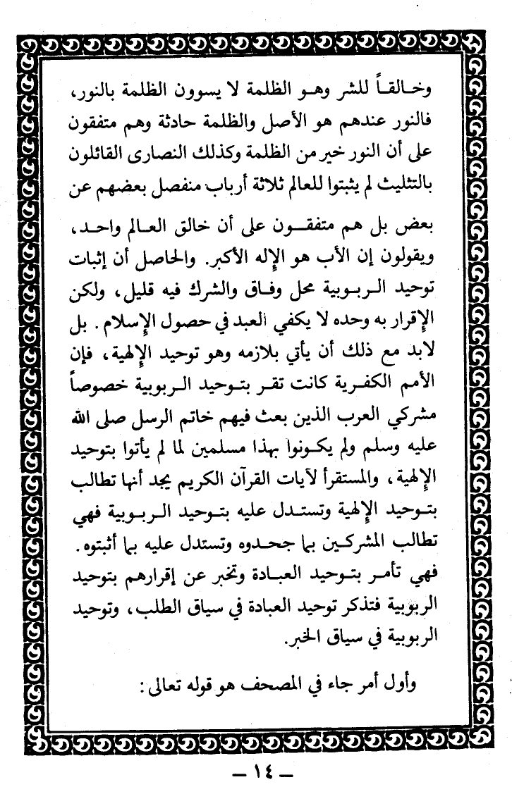 وخالقا للشّر وهو الظلمة، لا يسوون الظلمة بالنّور، فالنّور عندهم هو الأصل، والظلمة حادثة، وهم متفقون على أنّ النّور خيرٌ من الظلمة. وكذلك النّصارى القائلون بالتثليث، لم يثبتوا للعالم ثلاثة أرباب منفصل بعضهم عن بعض، بل هم متفقون على أنّ خالق العالم واحد، ويقولون: إنّ الأب هو الإله الأكبر.