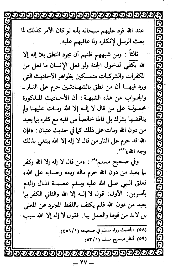 وفي صحيح مسلم2: "من قال: لا إله إلاّ الله، وكفر بما يُعبد من دون الله؛ حرم ماله ودمه وحسابه على الله"، فعلّق النّبيّ صلى الله عليه وسلم عصمة المال والدم بأمرين: الأول: قول لا إله إلاّ الله. والثاني: الكفر بما يعبد من دون الله. فلم يكتفِ باللفظ المجرّد عن المعنى، بل لا بد من قولها والعمل بها.