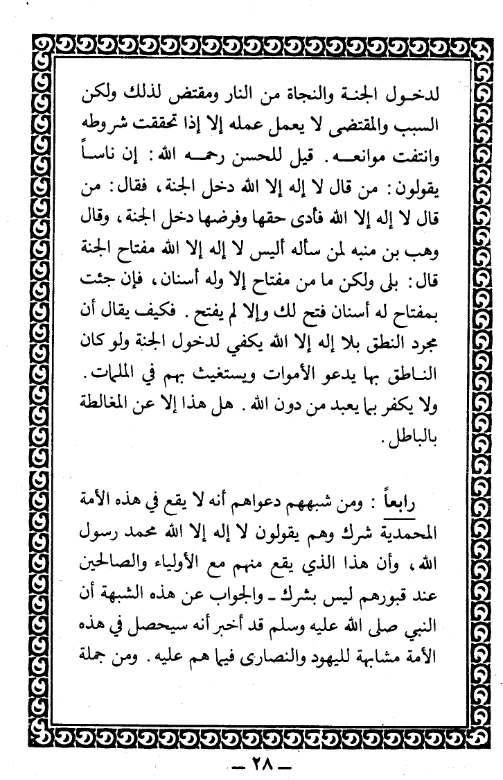 رابعا: ومن شُبههم: دعواهم أنّه لا يقع في هذه الأمّة المحمّديّة شرك، وهم يقولون: لا إله إلاّ الله محمّد رسول الله، وأنّ هذا الذي يقع منهم مع الأولياء والصالحين عند قبورهم ليس بشرك.