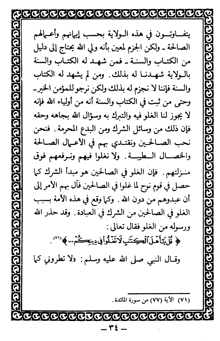 فنحن نحبّ الصالحين ونقتدي بهم في الأعمال الصّالحة والخصال الطيِّبة، ولا نغلوا فيهم ونرفعهم فوق منزلتهم، فإنّ الغلو في الصّالحين هو مبدأ الشرك، كما حصل في قوم نوح لمّا غلوا في الصّالحين، فآل بهم الأمر إلى أن عبدوهم من دون الله، وكما وقع في هذه الأمّة بسبب الغلو في الصّالحين من الشرك في العبادة، وقد حذّر الله ورسوله صلى الله عليه وسلم من الغلو، فقال تعالى: {قُلْ يَا أَهْلَ الْكِتَابِ لا تَغْلُوا فِي دِينِكُمْ} 1. وقال النّبيّ صلى الله عليه وسلم: "لا تطروني كما