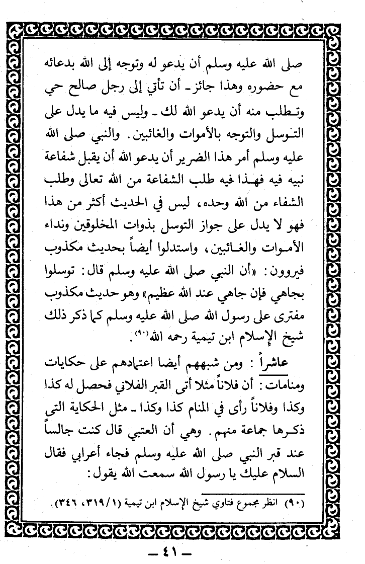 عاشرًا: ومن شُبههم - أيضا -: اعتمادهم على حكايات ومنامات. أنّ فلانا مثلاً أتى القبر الفلاني فحصل له كذا وكذا، وفلانا رأى في المنام كذا وكذا، مثل الحكاية التي ذكرها جماعة منهم. وهي أنّ العتبي قال: "كنت جالسا عند قبر النّبيّ صلى الله عليه وسلم، فجاء أعرابي فقال: السّلام عليك يا رسول الله، سمعت الله يقول: