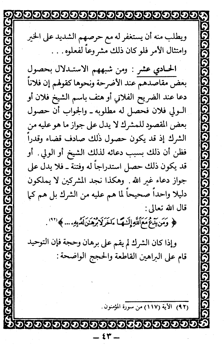 والجواب: أنّ حصول بعض المقصود للمشرك لا يدل على جواز ما هو عليه من الشرك، إذ قد يكون حصول ذلك صادف قضاءً وقدرًا، فظنّ أن ذلك بسبب دعائه لذلك الشيخ أو الولي. أو قد يكون ذلك حصل استدراجا له وفتنة، فلا يدلّ على جواز دعاء غير الله.
