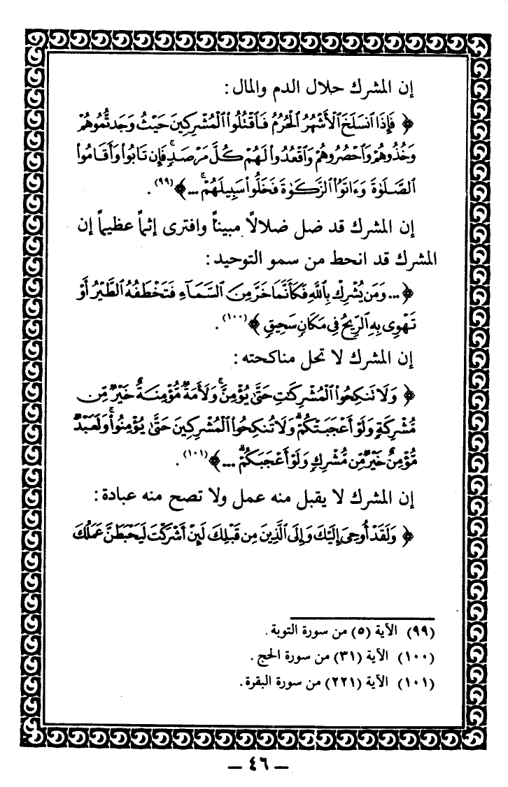 إنّ المشرك حلال الدّم والمال، قال تعالى: {فَإِذَا انْسَلَخَ الأشْهُرُ الْحُرُمُ فَاقْتُلُوا الْمُشْرِكِينَ حَيْثُ وَجَدْتُمُوهُمْ وَخُذُوهُمْ وَاحْصُرُوهُمْ وَاقْعُدُوا لَهُمْ كُلَّ مَرْصَدٍ فَإِنْ تَابُوا وَأَقَامُوا الصَّلاةَ وَآتَوُا الزَّكَاةَ فَخَلُّوا سَبِيلَهُمْ} 1.