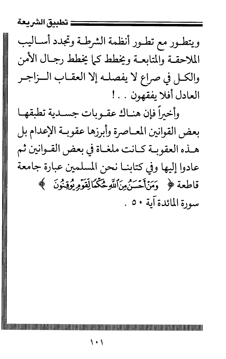 وأخيرًا فإن هناك عقوبات جسدية تطبقها بعض القوانين المعاصرة وأبرزها عقوبة الإعدام بل هذه العقوبة كانت ملغاة في بعض القوانين ثم عادوا إليها وفي كتابنا نحن المسلمين عبارة جامعة قاطعة {وَمَنْ أَحْسَنُ مِنَ اللَّهِ حُكْمًا لِقَوْمٍ يُوقِنُونَ} [المائدة: 50] سورة المائدة آية 50.
