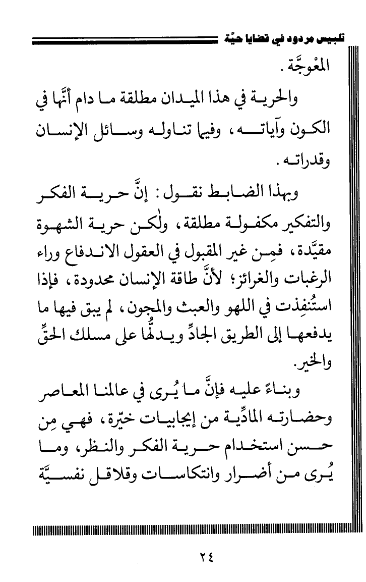 وبناءً عليه فإنَّ ما يُرى في عالمنا المعاصر وحضارته المادِّية من إيجابيات خيّرة، فهي مِن حسن استخدام حرية الفكر والنظر، وما يرى من أضرار وانتكاسات وقلاقل نفسية