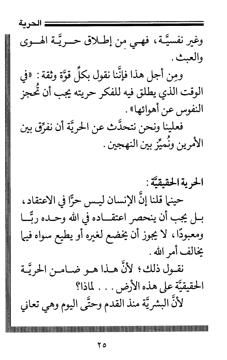 الحرية الحقيقيَّة حينما قلنا إنَّ الإنسان ليس حرًّا في الاعتقاد، بل يجب أن ينحصر اعتقاده في الله وحده ربًّا ومعبودًا، لا يجوز أن يخضع لغيره أو يطيع سواه فيما يخالف أمر الله.