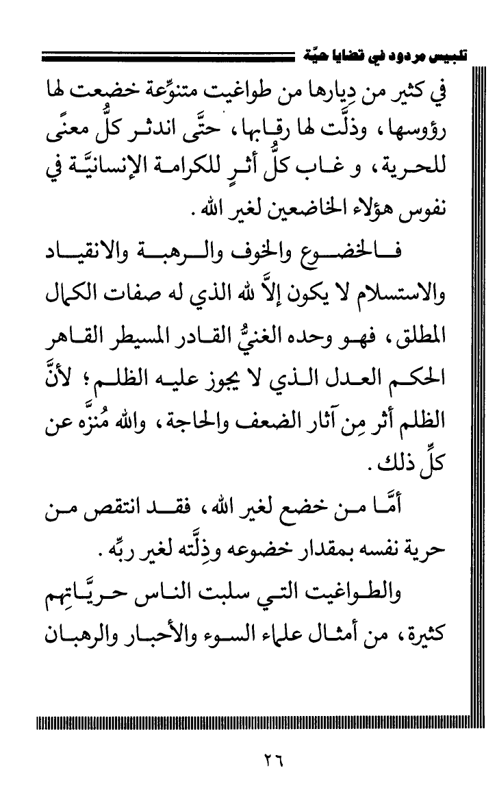في كثير من دِيارها من طواغيت متنوِّعة خضعت لها رءوسها، وذلَّت لها رقابها، حتَّى اندثر كلُّ معنًى للحرية، وغاب كلُّ أثرٍ للكرامة الإنسانيَّة في نفوس هؤلاء الخاضعين لغير الله.