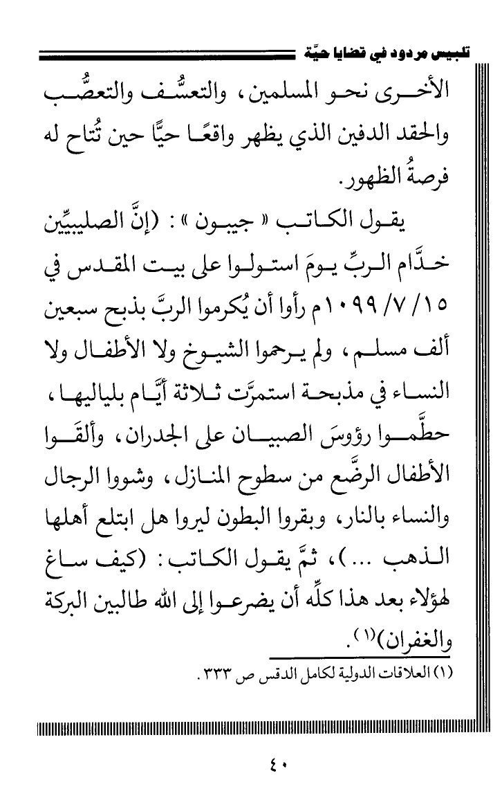 يقول الكاتب " جيبون ": (إنَّ الصليبيِّين خدَّام الربِّ يومَ استولوا على بيت المقدس في 15 7 1099 م رأوا أن يُكرموا الربَّ بذبح سبعين ألف مسلم، ولم يرحموا الشيوخ ولا الأطفال ولا النساء في مذبحة استمرَّت ثلاثة أيَّام بلياليها، حطَّموا رءوسَ الصبيان على الجدران، وألقَوا الأطفال الرضَّع من سطوح المنازل، وشووا الرجال والنساء بالنار، وبقروا البطون ليروا هل ابتلع أهلها الذهب. . .) ، ثمَّ يقول الكاتب: (كيف ساغ لهؤلاء بعد هذا كلِّه أن يضرعوا إلى الله طالبين البركة والغفران) (¬1) .