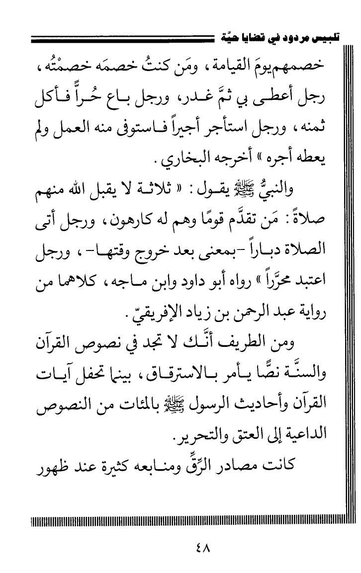 والنبي صلى الله عليه وسلم يقول: «ثلاثة لا يقبل الله منهم صلاةً: مَن تقدَّم قومًا وهم له كارهون، ورجل أتى الصلاة دبارًا - بمعنى بعد خروج وقتها -، ورجل اعتبد محرَّرًا» رواه أبو داود وابن ماجه، كلاهما من رواية عبد الرحمن بن زياد الإفريقيّ.