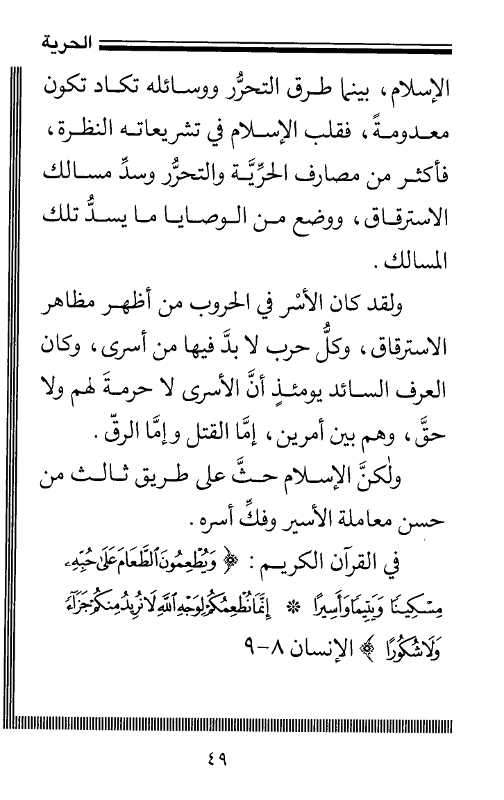 الإسلام، بينما طرق التحرُّر ووسائله تكاد تكون معدومةً، فقلب الإسلام في تشريعاته النظرة، فأكثر من مصارف الحرِّيَّة والتحرّر وسدِّ مسالك الاسترقاق، ووضع من الوصايا ما يسدُّ تلك المسالك.