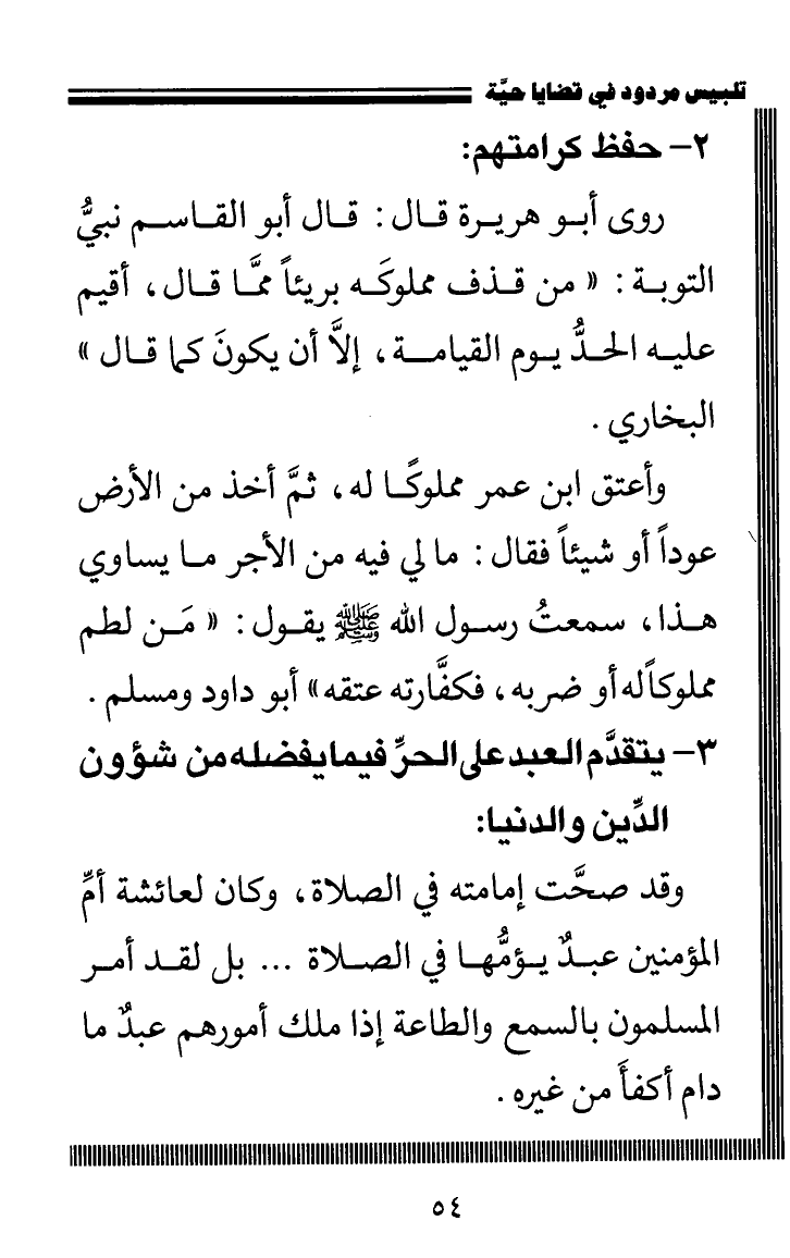 2 - حفظ كرامتهم: روى أبو هريرة قال: قال أبو القاسم نبيُّ التوبة: «من قذف مملوكَه بريئًا ممَّا قال، أقيم عليه الحدُّ يوم القيامة، إلاَّ أن يكونَ كما قال» البخاري.