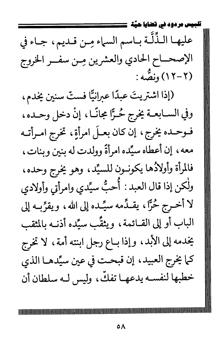 (إذا اشتريتَ عبدًا عبرانيًّا فستّ سنين يخدم، وفي السابعة يخرج حُرًّا مجانًا، إن دخل وحده، فوحده يخرج، إن كان بعلَ امرأةٍ، تخرج امرأته معه، إن أعطاه سيِّده امرأةً وولدت له بنين وبنات، فالمرأة وأولادُها يكونون للسيِّد، وهو يخرج وحده، ولكن إذا قال العبد: أحب سيِّدي وامرأتي وأولادي لا أخرج حُرًّا، يقدِّمه سيِّده إلى الله، ويقرِّبه إلى الباب أو إلى القائمة، ويثقِّب سيِّده أذنه بالمثقب يخدمه إلى الأبد، وإذا باع رجل ابنته أمة، لا تخرج كما يخرج العبيد، إن قبحت في عين سيِّدها الذي خطبها لنفسه يدعها تفكّ، وليس له سلطان أن