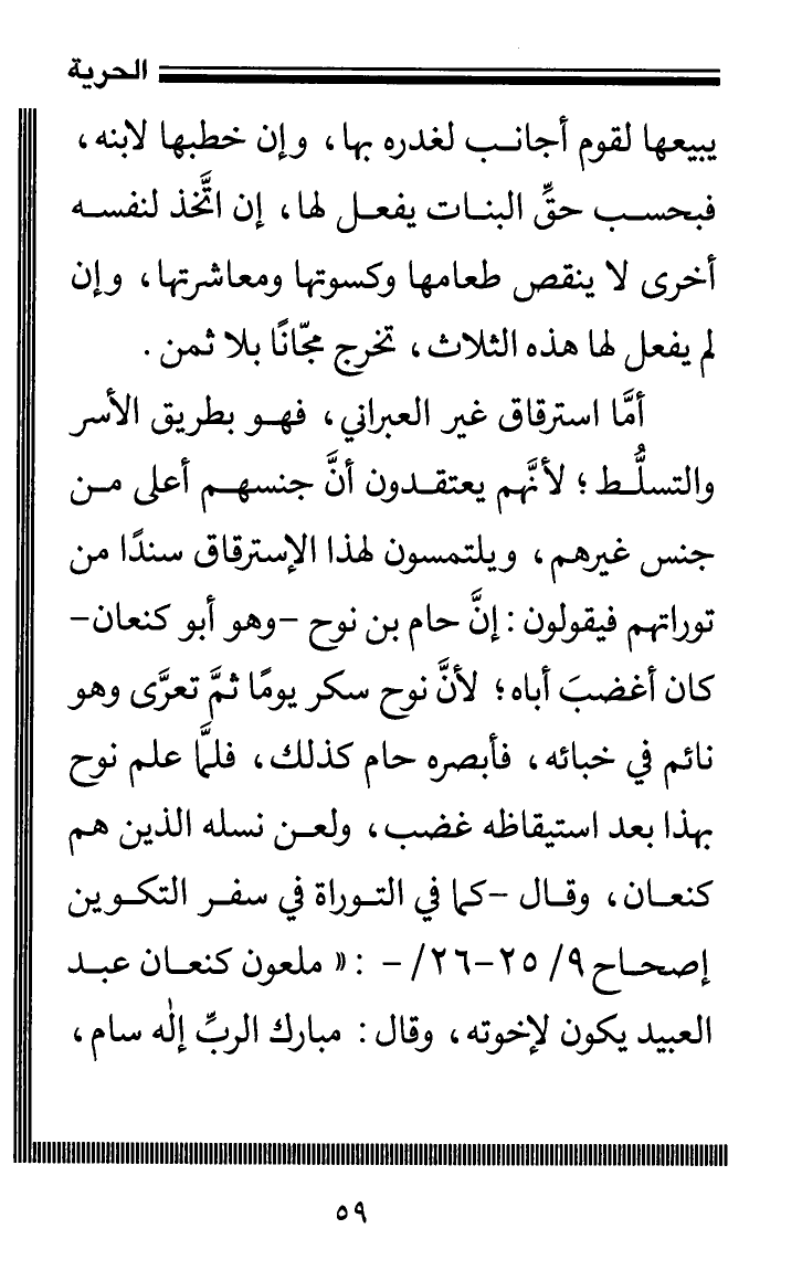 أما استرقاق غير العبراني، فهو بطريق الأسر والتسلط؛ لأنهم يعتقدون أن جنسهم أعلى من جنس غيرهم، ويلتمسون لهذا الاسترقاق سندًا من توراتهم فيقولون: إنَّ حام بن نوح - وهو أبو كنعان - كان أغضبَ أباه؛ لأنَّ نوحًا سكر يومًا ثمَّ تعرَّى وهو نائم في خبائه، فأبصره حام كذلك، فلمَّا علم نوح بهذا بعد استيقاظه غضب، ولعن نسله الذين هم كنعان، وقال - كما في التوراة في سفر التكوين إصحاح 9 / 25 - 26 / -: " ملعون كنعان عبد العبيد يكون لإخوته، وقال: مبارك الربِّ إله سام،