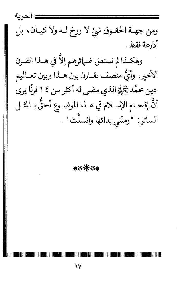 وهكذا لم تستفق ضمائرهم إلاَّ في هذا القرن الأخير، وأيُّ منصف يقارن بين هذا وبين تعاليم دين محمَّد صلى الله عليه وسلم الذي مضى له أكثر من 14 قرنًا يرى أنَّ إقحام الإسلام في هذا الموضوع أحقُّ بالمثل السائر: " رمتني بدائها وانسلَّت ".