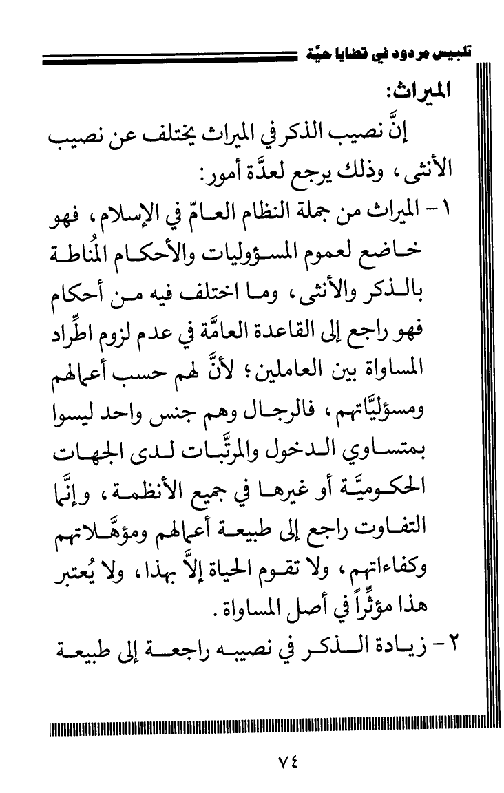 1 - الميراث من جملة النظام العامّ في الإسلام، فهو خاضع لعموم المسئوليات والأحكام المنُاطة بالذكر والأنثى، وما اختلف فيه من أحكام فهو راجع إلى القاعدة العامَّة في عدم لزوم اطِّراد المساواة بين العاملين؛ لأنَّ لهم حسب أعمالهم ومسؤلياتهم، فالرجال وهم جنس واحد ليسوا بمتساوي الدخول والمرتَّبات لدى الجهات الحكوميَّة أو غيرها في جميع الأنظمة، وإنَّما التفاوت راجع إلى طبيعة أعمالهم ومؤهَّلاتهم وكفاءاتهمِ، ولا تقوم الحياة إلاَّ بهذا، ولا يُعتبر هذا مؤثِّراَ في أصل المساواة.